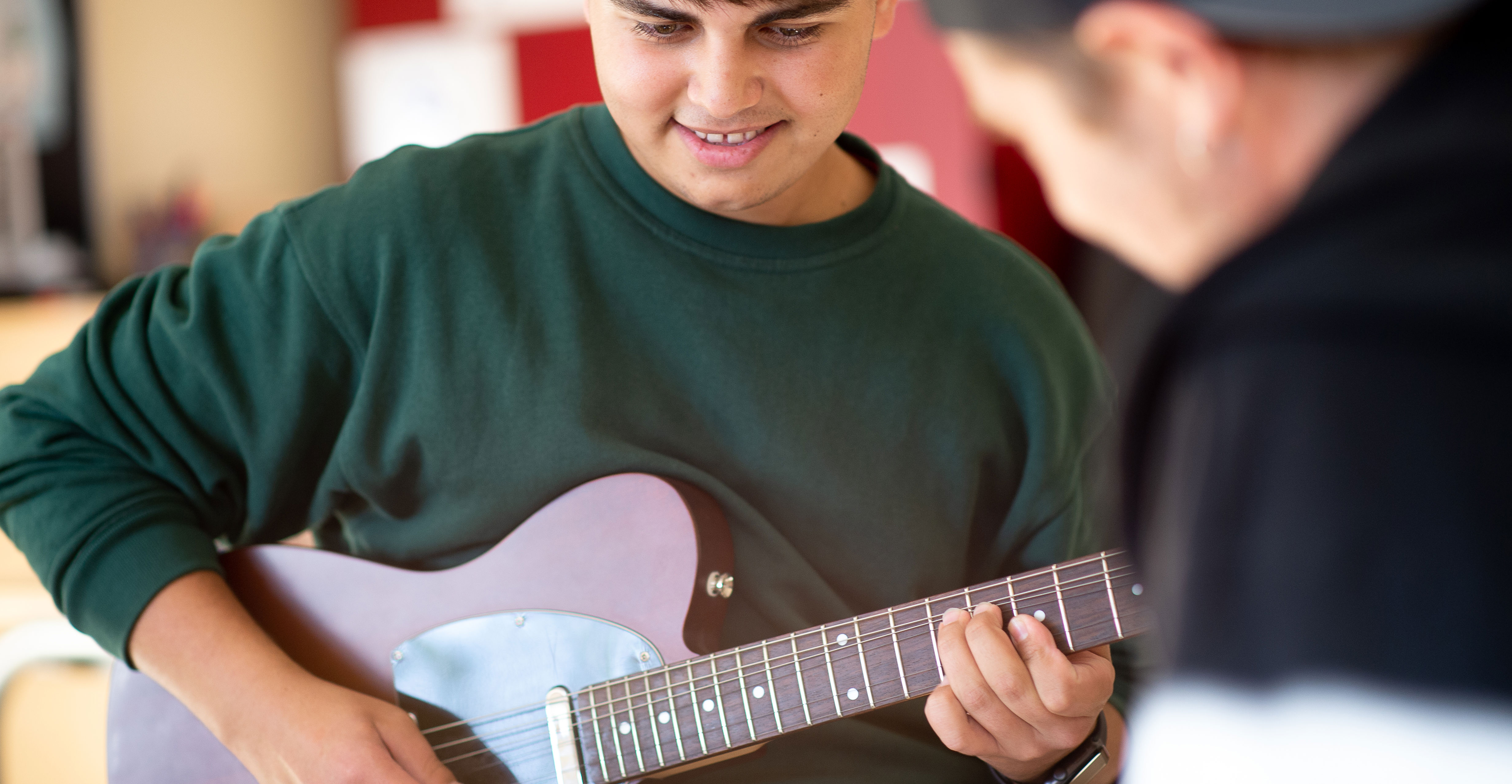 I undervisningen arbejder vi med alle de ting, du skal lære for at blive en god guitarist - du lærer at spille akkorder, at improvisere (spille solo), at spille de seje guitar-riffs og mange andre ting. Der er også mulighed for at spille med i et af musikskolens mange bands.