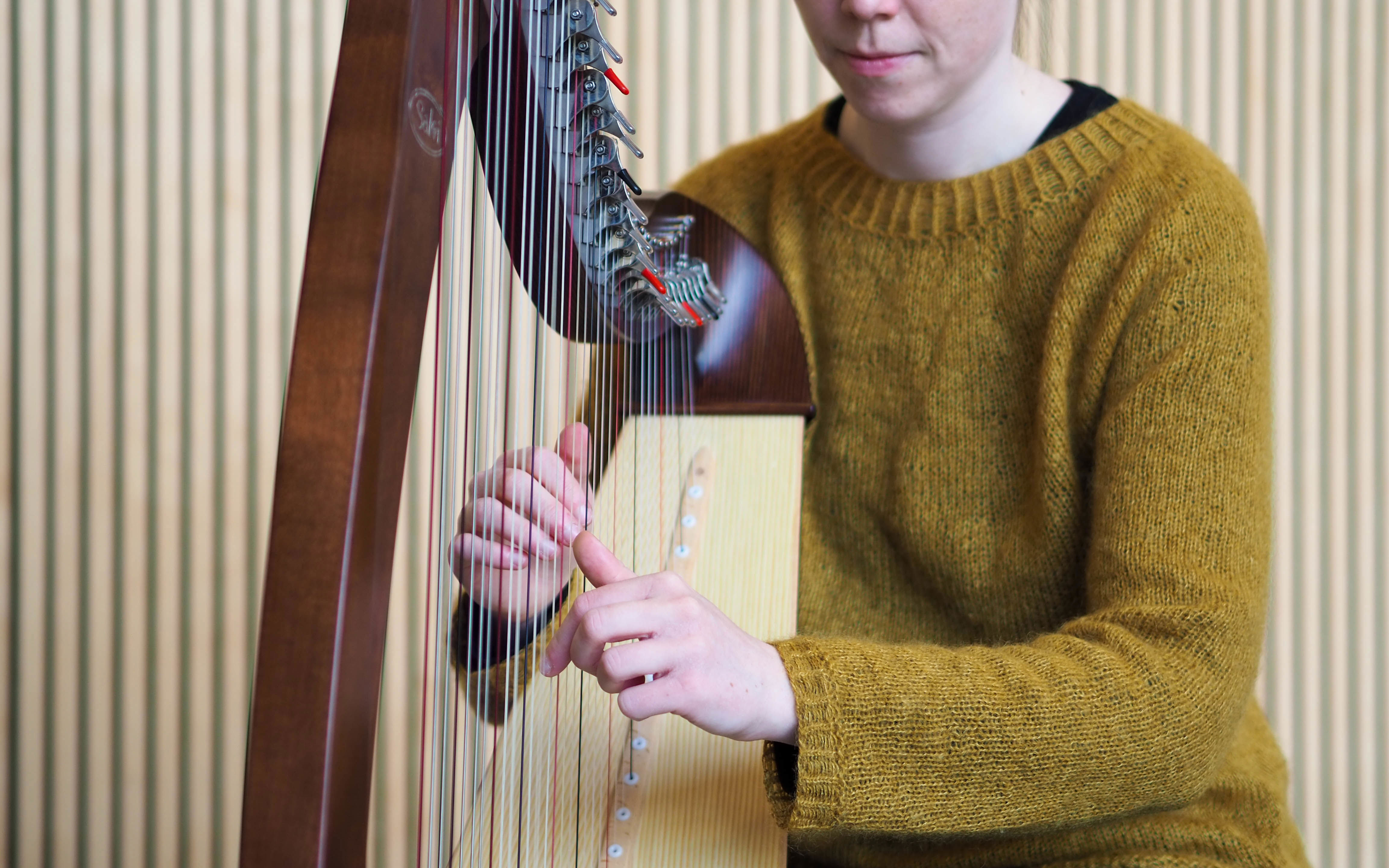 Harpen har 34 strenge og kan spille mange slags musik: Folkemusik fra nær og fjern, middelalder- og renæssancemusik, filmmusik, sange og meget mere.